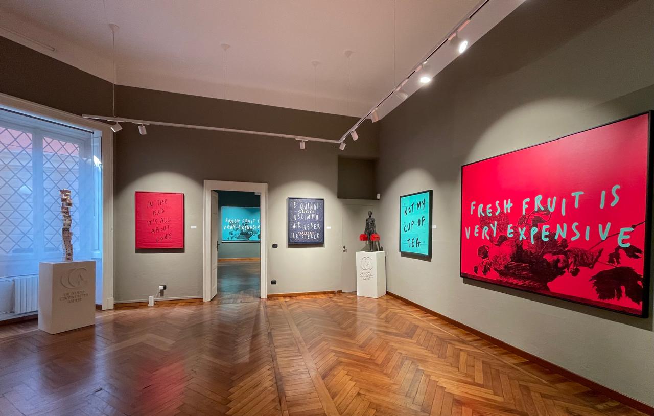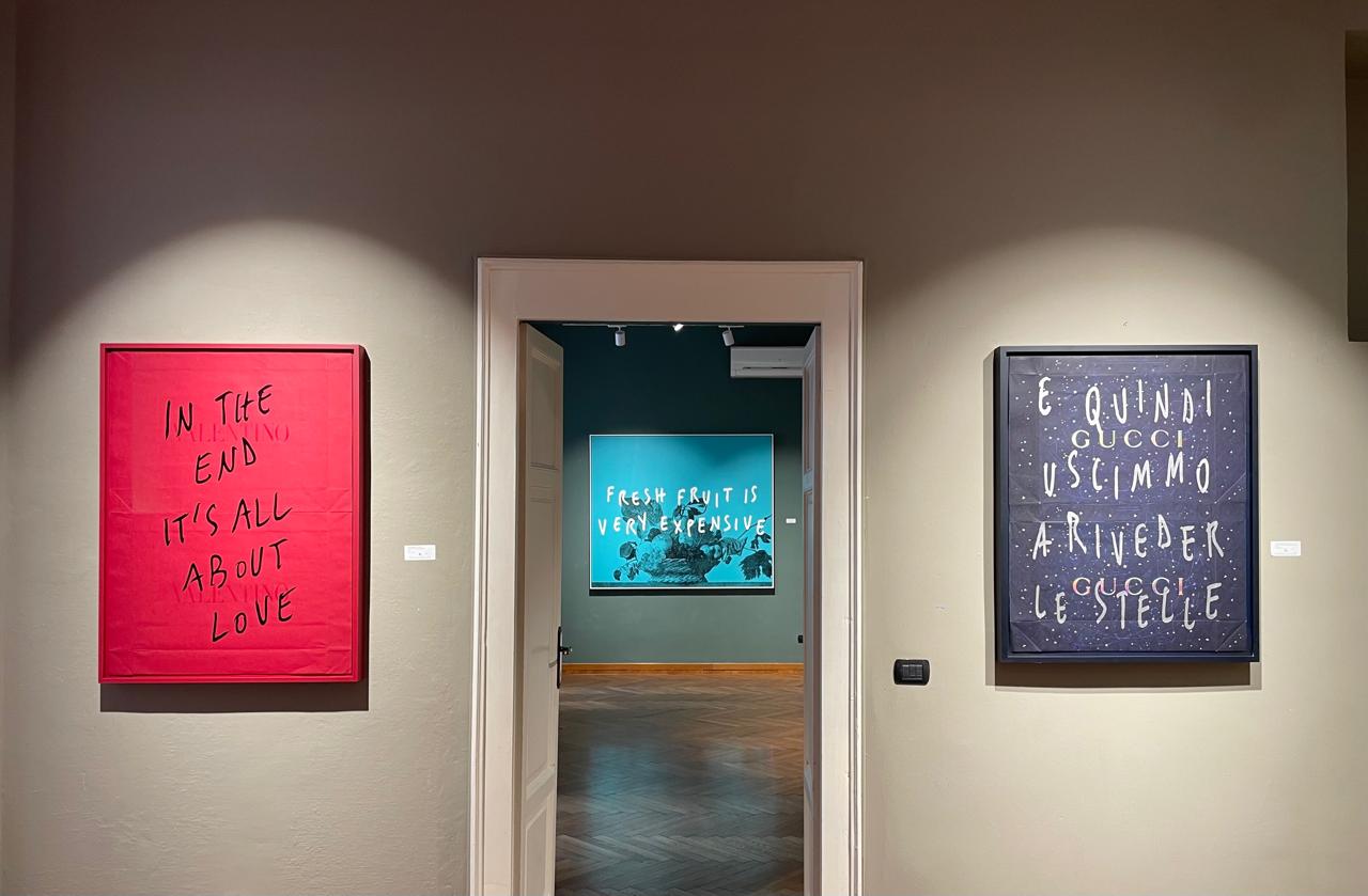«Questa opera su un vecchio sacchetto di Gucci parla del tempo che passa e della necessità di goderlo. È una dedica romantica, un gioco tra le stelle e le parole», spiega mentre cammina tra le sale. «E poi, questa dedicata a Casa Cipriani... un piccolo omaggio alla bellezza e ai piaceri semplici: pasta, vino e baci. La vita, insomma.»
