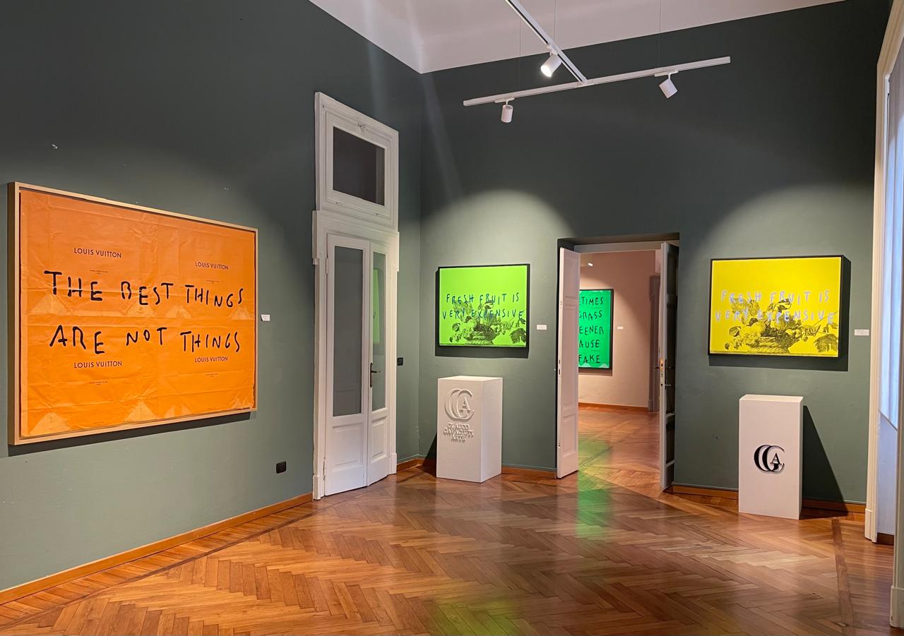 Durante il tour nello spazio espositivo, Glauco mostra alcune opere di Pietro: tele ispirate alla celebre Canestra di frutta di Caravaggio, reinterpretazioni ironiche di icone come Schiaparelli e Gucci, e una serie di lavori dedicati ai messaggi (“DM”) che l’artista ha trasformato in un libro d’artista andato esaurito.